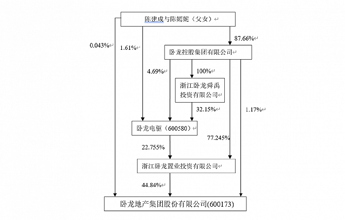股权结构显示,卧龙电驱持有卧龙地产的控股股东浙江卧龙置业投资有限公司22.755%股份,且卧龙电驱的控股股东与卧龙地产间接控股股东都为卧龙控股。