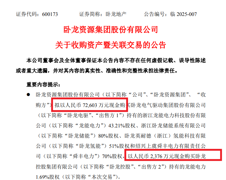 在房地产行业持续调整的背景下,卧龙地产的每一步转型都备受关注。近期,卧龙地产发布公告,拟以7.5亿元现金从关联方手中收购四家新能源相关公司股权,这一动作被视为其向新能源产业转型的关键一步。然而,此次收购中,4家标的公司中有3家亏损,且卧龙地产自身资金压力巨大,这无疑为此次收购蒙上了一层神秘的面纱。