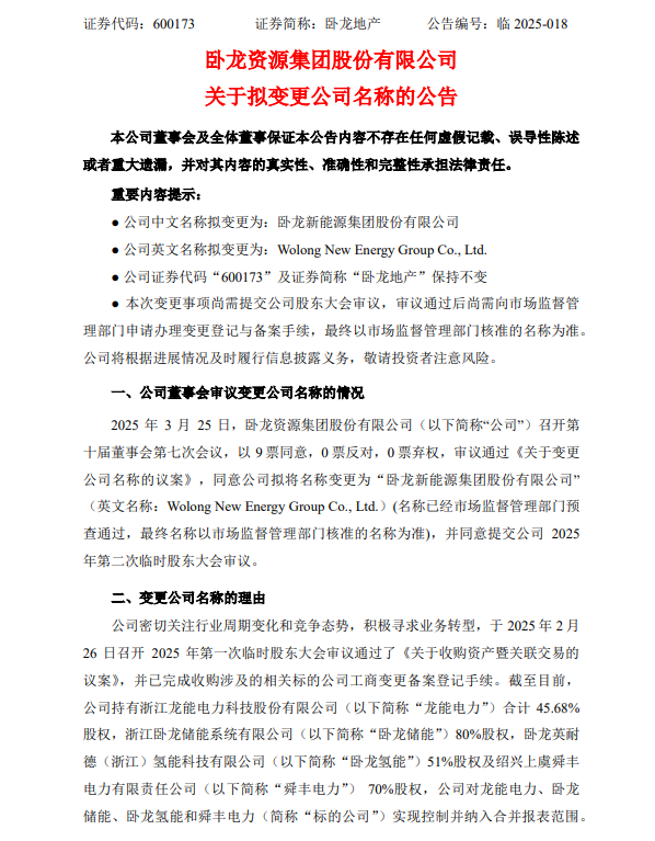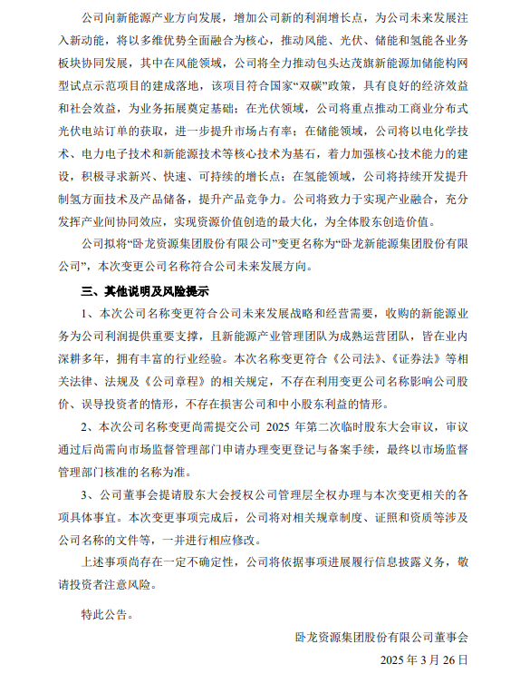 3月26日,卧龙地产发布卧龙资源集团股份有限公司关于拟变更公司名称的公告。