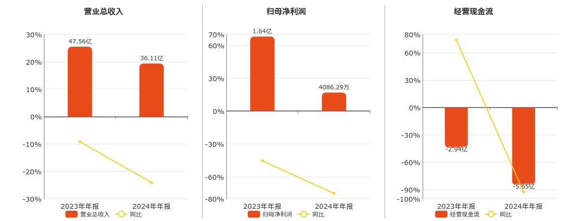公司营业总收入为36.11亿元,较去年同报告期营业总收入减少11.45亿元,同比较去年同期下降24.08%。归母净利润为4086.29万元,较去年同报告期归母净利润减少1.24亿元,同比较去年同期下降75.15%。经营活动现金净流入为-5.65亿元,较去年同报告期经营活动现金净流入减少2.71亿元。