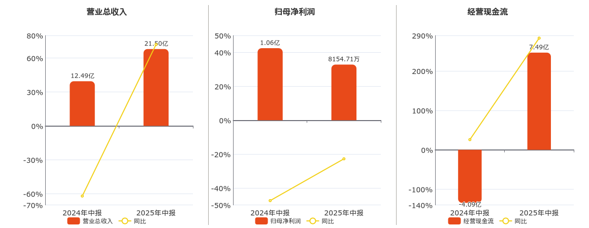 公司营业总收入为21.50亿元,较去年同报告期营业总收入增加5.73亿元,同比较去年同期上涨36.38%。归母净利润为8154.71万元。经营活动现金净流入为7.49亿元,较去年同报告期经营活动现金净流入增加10.69亿元,实现3年连续上涨。