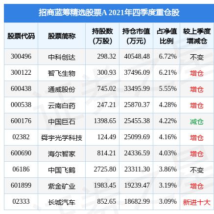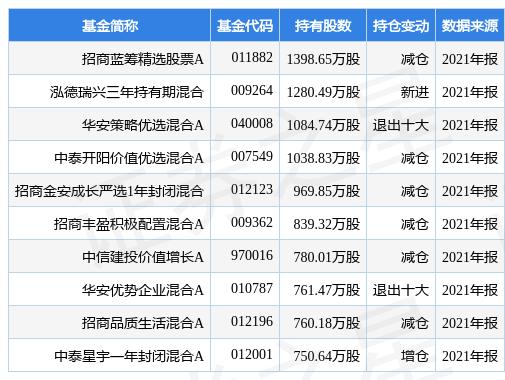 根据2021年报基金重仓股数据,重仓该股的基金共551家,其中持有数量最多的基金为招商蓝筹精选股票A。招商蓝筹精选股票A目前规模为58.7亿元,最新净值0.8417(3月22日),较上一日下跌0.18%。该基金现任基金经理为王景。王景在任的公募基金包括:招商制造业混合A,管理时间为2015年12月2日至今,期间收益率为176.69%;招商3年封闭瑞利混合,管理时间为2019年7月18日至今,期间收益率为85.07%;招商瑞泽一年持有期混合A,管理时间为2020年8月27日至今,期间收益率为2.68%;招商瑞德一年持有期混合A,管理时间为2021年1月26日至今,期间收益率为3.37%。