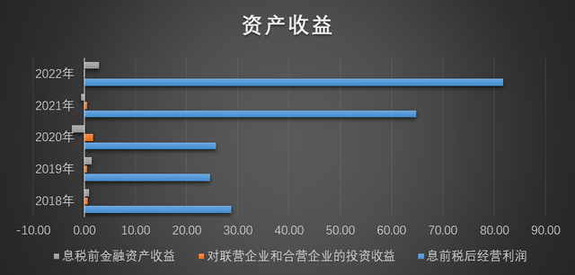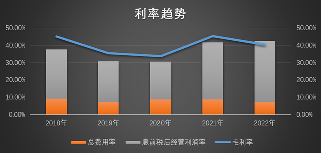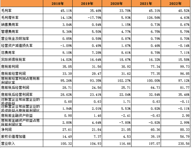 (四)息税前经营利润2022年96.85亿(中位数33.39,均值53.74),较2021年提升25.22%;息前税后经营利润2022年81.77亿(中位数28.71,均值45.10),较2021年提升26.32%,保持高速增长;息前税后经营利润率2022年35.46%(中位数28.62%,均值28.47%),较2021年提升7.97%,高于历史平均;在息税前利润中,经营利润占比97.12%,金融资产收益占比2.99%,投资收益占比-0.11%。