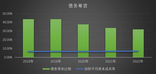 (二)公司债务筹资体量在逐年增加,债务资本2022年在总资本中占比31.91%(中位数37.66%,均值38.04%);加权平均资产成本7.05%(中位数6.82%,均值6.85%)。