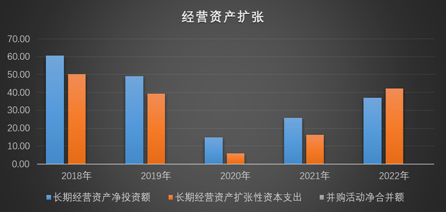 (一)长期经营资产净投资额2022年37.13亿(中位数37.13,均值37.50),较2021年提升43.16%,峰值为2018年60.53亿;长期经营资产扩张性资本支出2022年42.19亿(中位数39.29,均值30.79),较2021年提升160.32%,2018年达到峰值50.31亿。公司维持自身规模扩张战略,但放慢了扩张的相对速度。