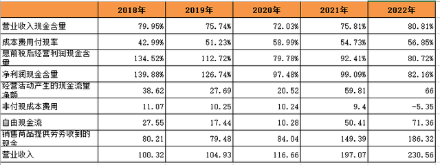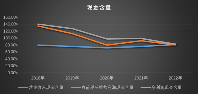 (一)营业收入现金含量2022年80.81%(中位数75.81%,均值76.87%),营业收入现金含量常年均小于1;成本费用付现率56.85%,成本费用付现率常年均小于1;息前税后经营利润现金含量80.72%(中位数92.41%,均值100.03%),较2021年降低12.65%;净利润现金含量82.16%(中位数99.09%,均值109.07%),较2021年降低17.09%;综合来看目前公司净利润真实一般,且营收质量不高。