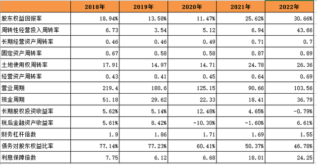 股东权益回报率2022年达阶段性峰值30.66%,比2021年提升19.66%。杜邦分解后发现:息税前经营利润率2022年43.25%(中位数34.94%,均值34.80%),较2021年39.25%提升10.21%;资产周转率2022年0.60次(中位数0.40,均值0.46),较2021年提升7.76%;财务杠杆倍数2022年1.55次(中位数1.71,均值1.74),较2021年降低8.57%,所以近年来公司股东权益回报率提升的主要原因还是息税前经营利润率的提升。