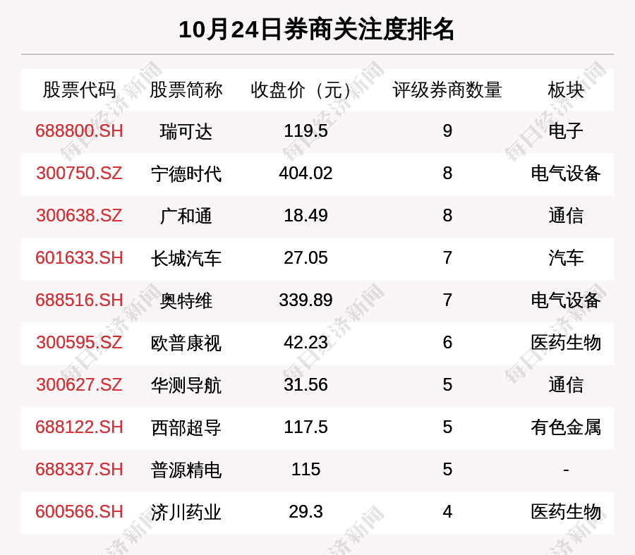 从券商对个股的关注程度来看,有43只个股获得多家券商关注,券商关注数量排名居前的个股是瑞可达(688800.SH)、宁德时代(300750.SZ)、广和通(300638.SZ)。