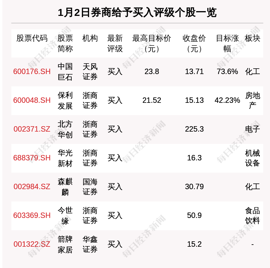1月2日,券商给予评级的个股数共有13只,获得买入评级的个股数共有7只。在公布了目标价格的2只个股中,按照最新收盘价计算,预期涨幅排名居前的个股是中国巨石(600176.SH)、保利发展(600048.SH),预期涨幅分别是73.6%、42.23%。