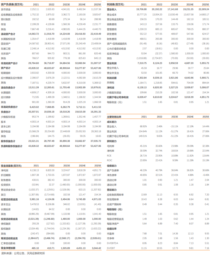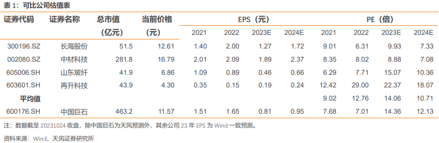 当前玻纤行业多数厂商已处于亏损状态,价格进一步向下空间有限,且当前盈利环境有助于引导行业新增产能有序扩张。中国巨石作为全球粗纱龙头及电子布龙头,具备成本及产品结构优势,继续看好行业应用场景拓展带来的需求渗透率提升及公司中长期成长性。考虑到公司 Q3 利润下滑较多,下调 23-25 年归母净利润预测至 32.2/38.2/48.5 亿元(前值:44.2/58.4/68.4 亿元)考虑到公司龙头地位,给予公司 24 年 16 倍目标 PE,对应目标价 15.20 元,维持“买入”评级。