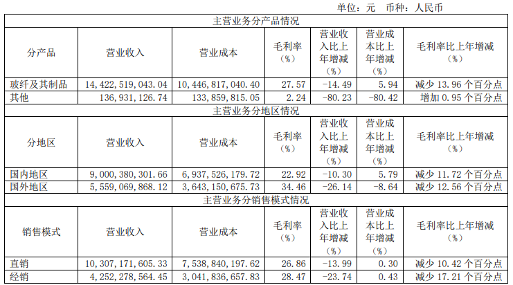 年报显示,公司主营产品收入主要是玻纤纱及制品的销售。2023 年公司玻纤纱及制品实现营业收入为144.23亿元,占主营业务收入的比例为 99.06%。与2022年相比,玻纤纱及制品营业收入下降 14.49%,营业成本上升 5.94%,毛利率下降 13.97 个百分点,主要原因是 2023 年全球经济环境不确定性加大,增长动力不足,供需失衡问题持续影响行业发展,玻纤产品销售价格大幅下降,导致公司营业收入和毛利率下降。