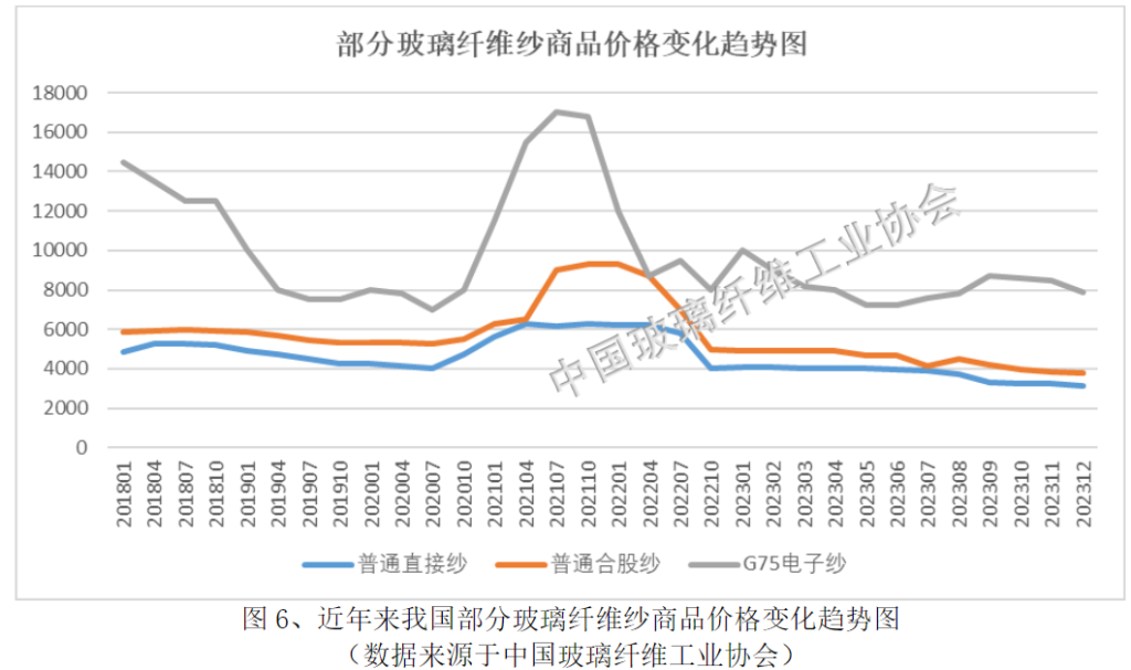 玻纤产品价格方面,受前期产能快速扩张及“双节”需求季节性回落影响,2023 年年初池窑企业库存压力快速加大,部分中小池窑企业因资金链紧张而率先开启降价模式,直接纱等部分规格化大宗产品价格屡创新低。年中,在部分细分市场需求小幅回温带动下,池窑企业逐步实现产销平衡,库存规模逐步恢复至正常状态,但在外围产业资本虎视眈眈下,市场整体信心不足,产品价格难觅回升之机。待到四季度,部分池窑企业为有效削减库存以便迎接市场新一轮季节性回落,再度启动降价模式。目前,大部分玻璃纤维纱产品均已处于历史最低价。