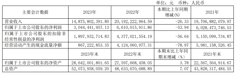2023年,公司实现扣非净利润18.98亿元,同比下降56.64%,连续两年下滑;经营活动产生的现金流净额8.67亿元,同比下滑78.97%,同样连续两年下滑。