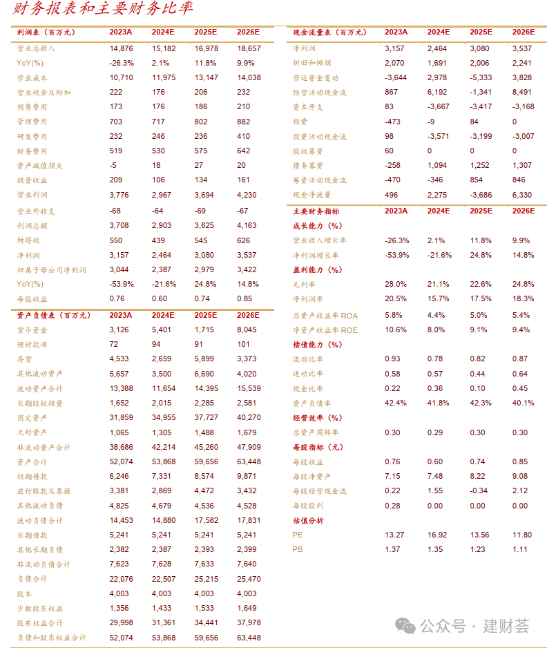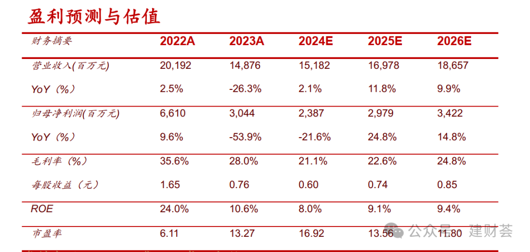 考虑到下游需求恢复仍有不确定,我们下调公司2024-26年的收入预测为151.82/169.78/186.57亿元(原153.42/171.58/190.36亿元);归母净利润预测为23.87/29.97/34.22亿元(原26.14/32.63/38.84亿元);对应预测EPS为0.60/0.74/0.85元(原0.65/0.82/0.97元);对应7月9日10.09元/股收盘价16.92/13.56/11.80x PE。维持“买入”评级。