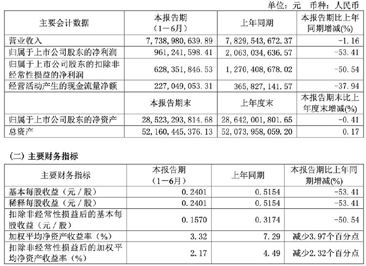 业绩方面,中国巨石2024年上半年,公司实现营业总收入77.39亿元,同比下降1.16%;归母净利润9.61亿元,同比下降53.41%;扣非净利润6.28亿元,同比下降50.54%;经营活动产生的现金流量净额为2.27亿元,同比下降37.94%;报告期内,中国巨石基本每股收益为0.2401元,加权平均净资产收益率为3.32%。
