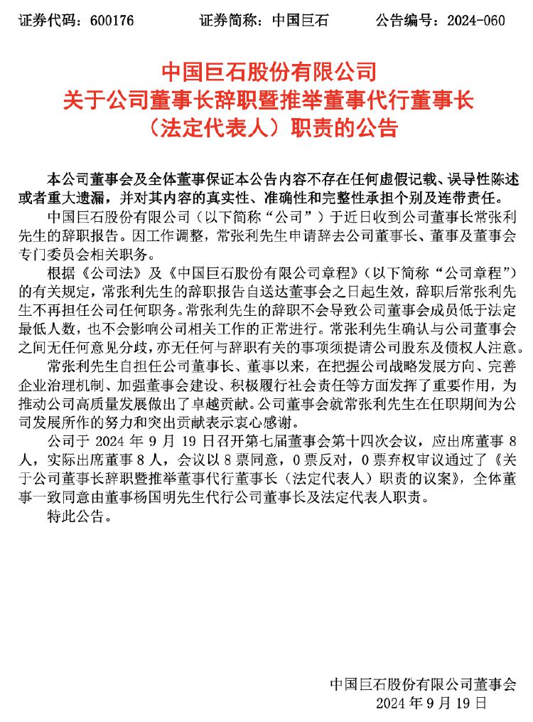 9月19日晚间,中国巨石(600176)公告,公司于近日收到董事长常张利的辞职报告,因工作调整,常张利申请辞去公司董事长、董事及董事会专门委员会相关职务。