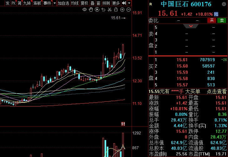 中国巨石今日盘中强势涨停,股价报收15.61元,较前一交易日大涨10.01%,成交额达4.42亿元。这一表现展现了市场对这家玻纤龙头企业的强烈信心。