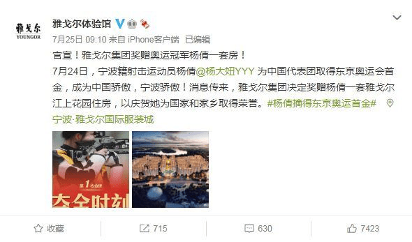 25日,雅戈尔集团宣布为庆祝杨倩为国家和家乡取得荣誉,将赠杨倩一套雅戈尔江上花园住房。