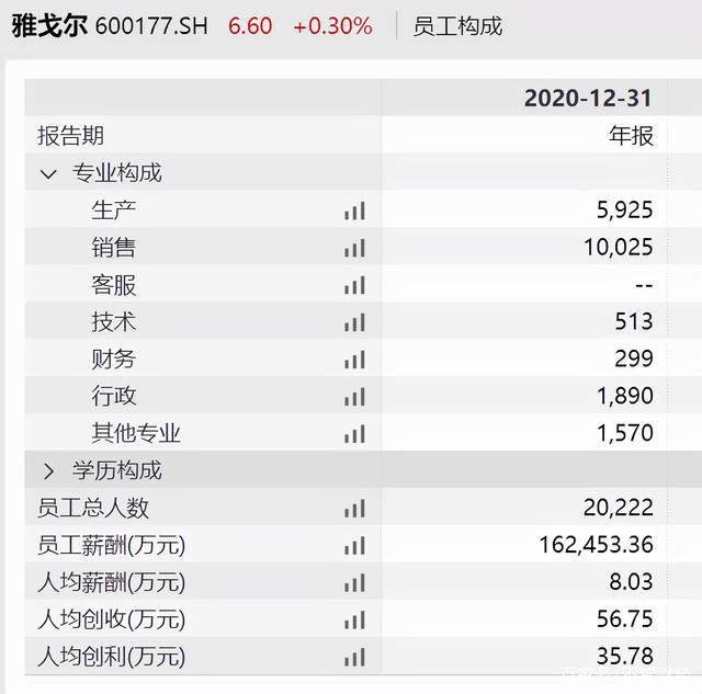 雅戈尔人均薪酬就比较少了,去年有员工2万多人,其中一半左右是销售,还有近1/4是生产制造端工人,因此人均薪酬刚刚超过8万元,比2019年略增加2200元。