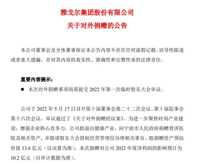 5月17日晚间,雅戈尔发布公告称,为进一步聚焦时尚产业建设,增强企业核心竞争力,公司拟退出健康产业,向宁波市人民政府捐赠普济医院及相关资产,并提请股东大会授权经营管理层办理相关事宜。拟捐赠资产预估价值 13.6 亿元(以决算为准),本次捐赠对公司 2022 年度净利润的影响预计为10.2 亿元(以审计数据为准)。
