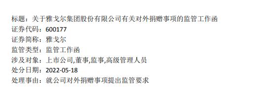 值得注意的是,针对上述捐赠事宜,5月18日,上交所向雅戈尔发监管工作函,就公司对外捐赠事项提出监管要求,涉及对象包括上市公司、董事、监事、高级管理人员。