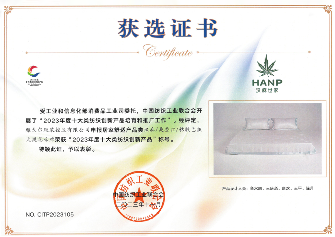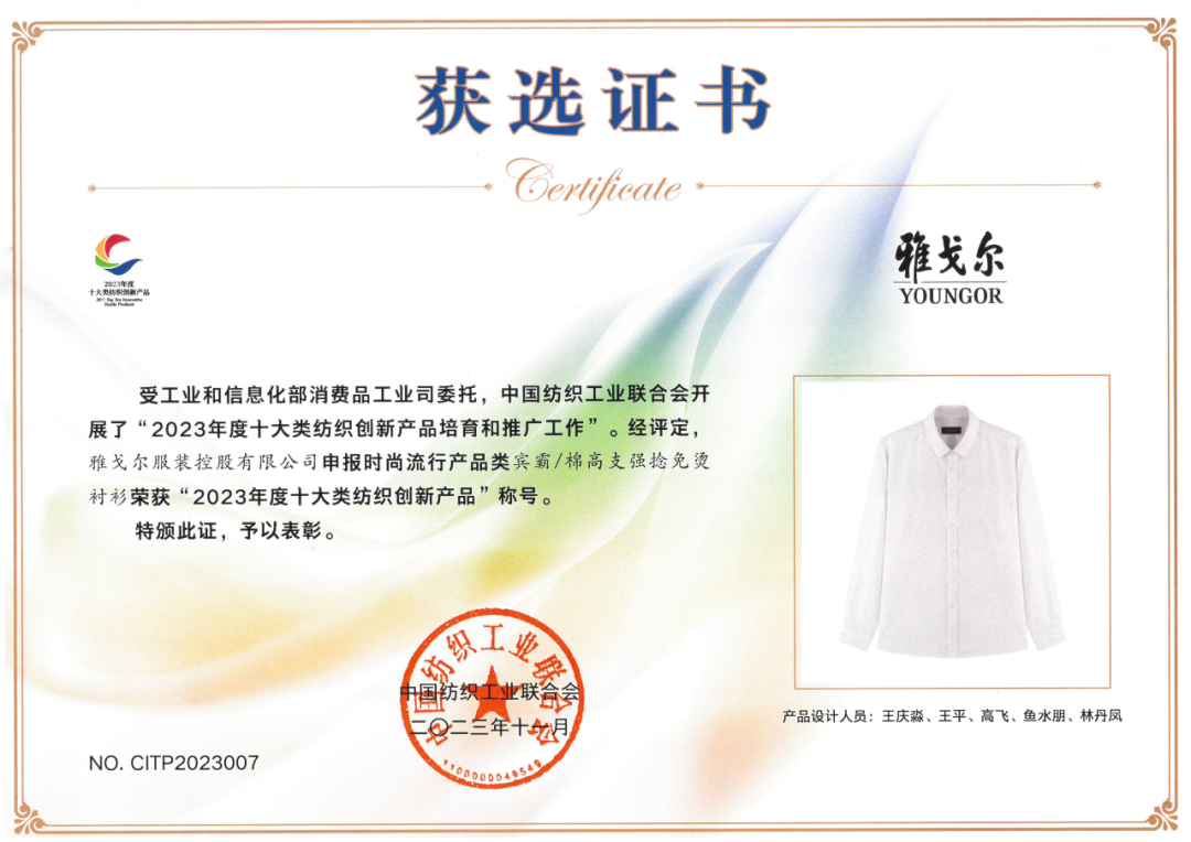 11月17日,2023世界服装大会在广东省东莞市虎门镇盛大开幕,会议同期还举行了“2023年度十大类纺织创新产品”颁奖典礼,“雅戈尔棉宾霸DP+免熨精品衬衫”和“天然抗菌汉麻真丝舒爽提花床品”入围。