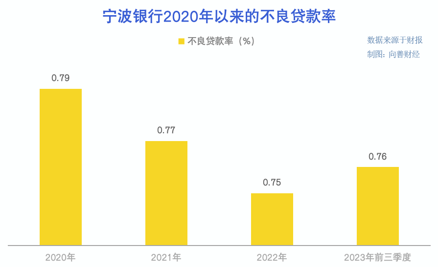 根据财报数据,2020年—2023年,宁波银行的不良贷款率分别为0.79%、0.77%、0.75%,2023年前三季度,不良贷款率为0.76%,整体不良贷款率基本都维持在低水平线上。