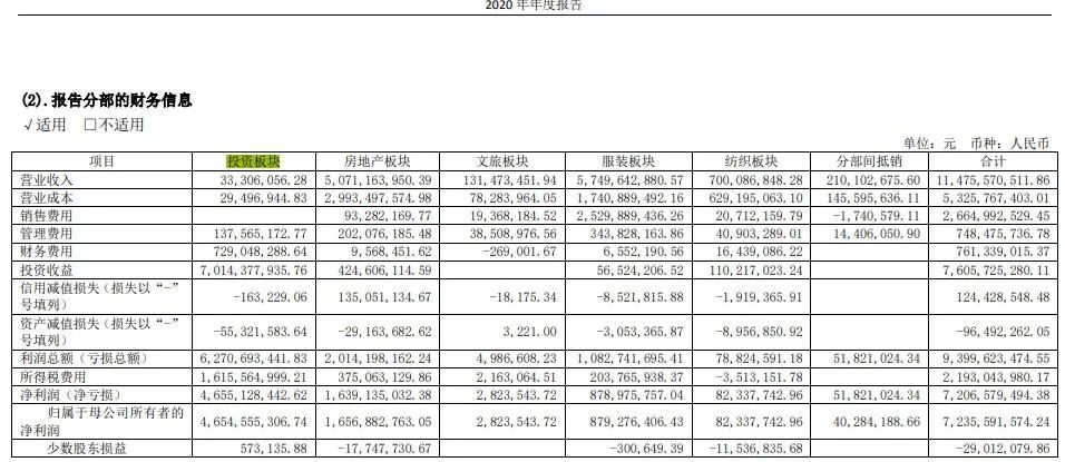 然2020年,公司投资板块营收3330.61万元,房地产为50.71亿元,文旅为1.32亿元,服装板块为57.50亿元、纺织为7亿元。时尚、地产和投资板块分别实现净利9.6亿、16.57亿、46.55亿元。孰轻孰重,一目了然。