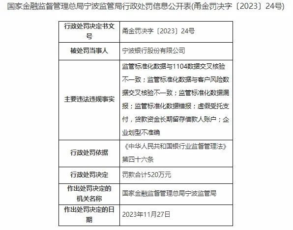 12月1日,宁波银行连收4张罚单,因监管标准化数据错报;虚假受托支付,贷款资金长期留存借款人账户;企业划型不准确等原因,被罚520万元。