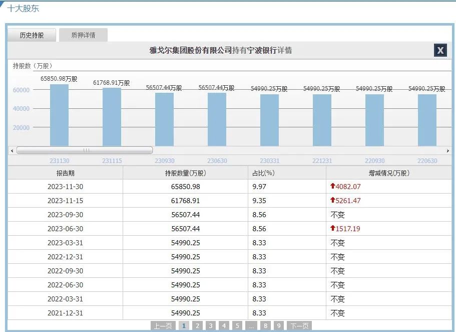 另据雅戈尔公告,截至2023年11月30日,公司共持宁波银行658,509,757股,占总股本比由6月底的8.33%增至9.97%。