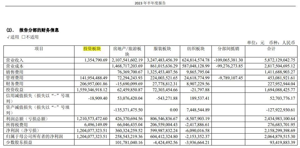 一石激起千层浪。要知道,虽是纺织服装业起家,雅戈尔近年来却在投资、地产上获利颇丰,常被质疑“不务正业”。2007年至2023年中,企业归母净利总和540亿元,累计投资净收益就达476.4亿元。