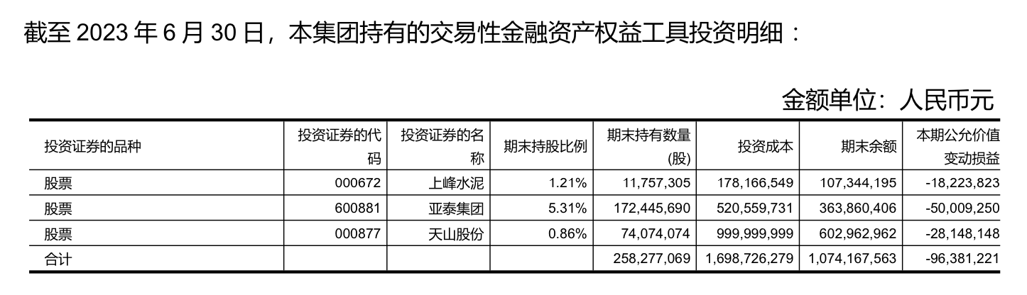 2023年的上半年,海螺水泥也在半年报中进行了详细的披露。截至2023年6月末,海螺水泥的期末余额进一步下降为10.74亿元,当期公允价值变动损益为-9.64亿元。