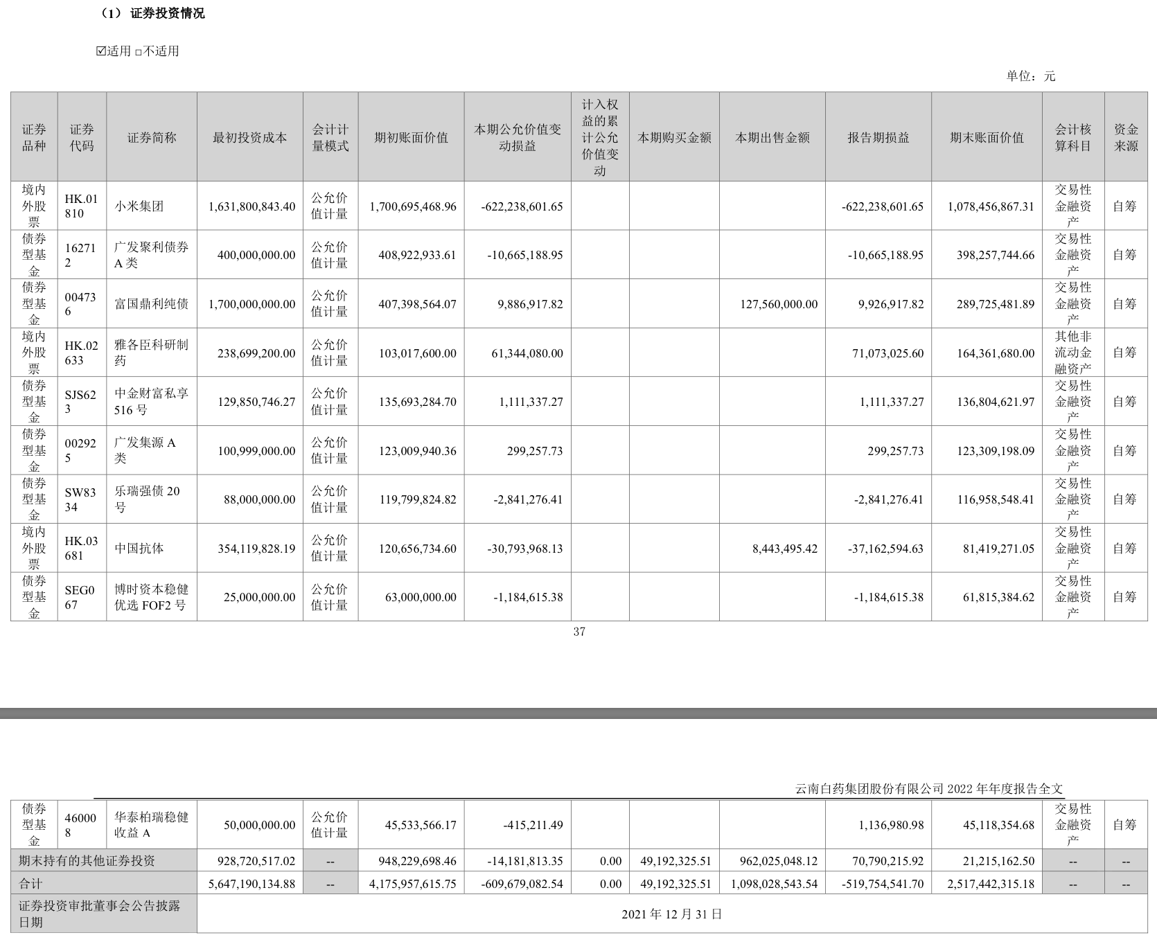 由此,云南白药拉开架势。不过从年报来看,真正开始“炒股”是从2019年开始。根据2019年年报,云南白药当年持股九州通(600998.SH)、红塔证券(601236.SH)、雅各臣科研制药(20633.HK)等,期末账面价值合计为76.62亿元,当期损益为4.09亿元。