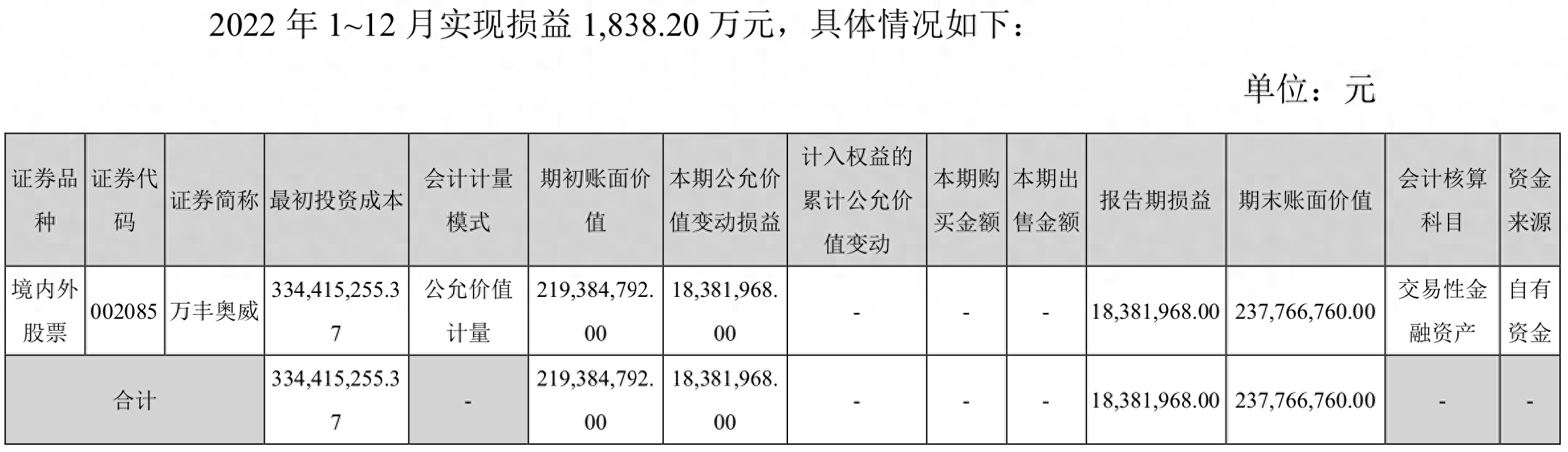 截至2022年12月31日,上海莱士仍持有万丰奥威股票3996.08万股,公司参与证券投资的金额为3.34亿元。2022年1~12月实现损益1838.20万元。
