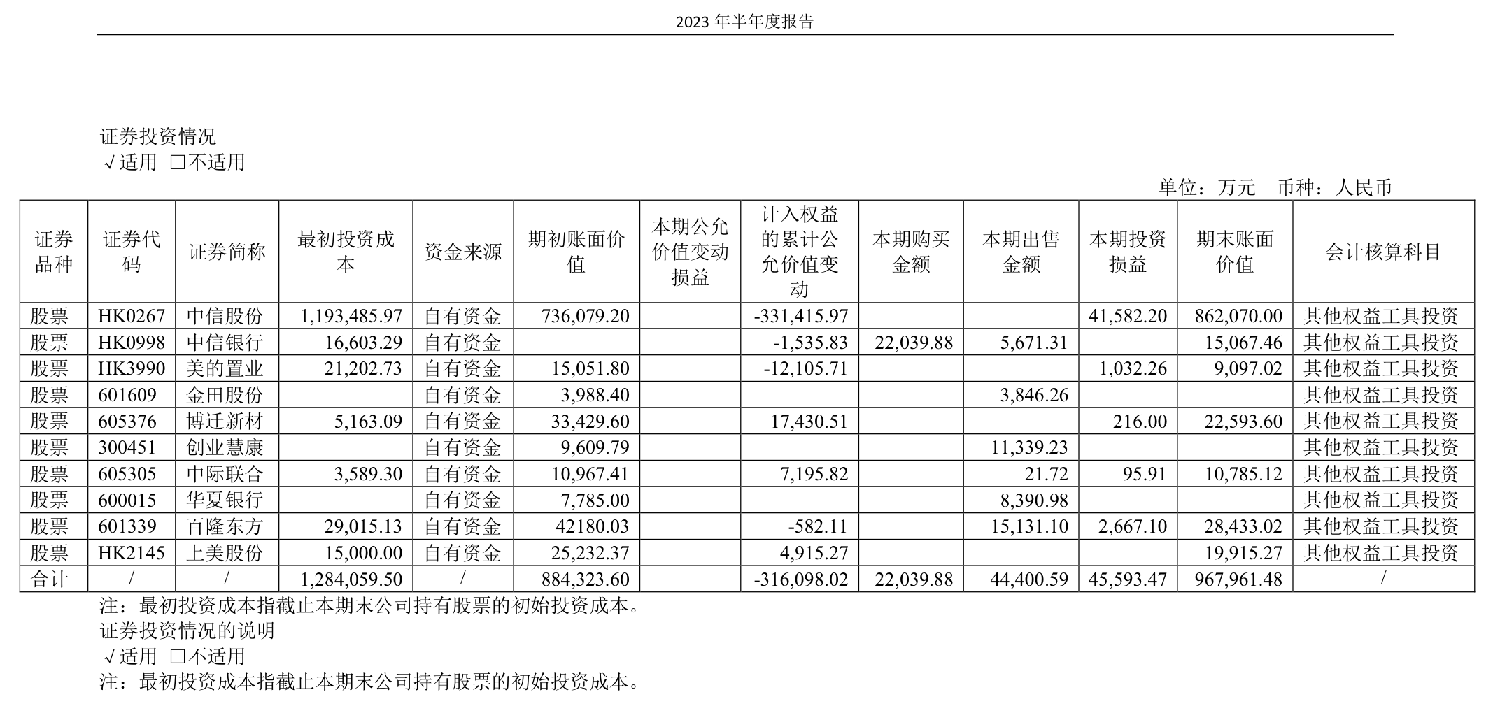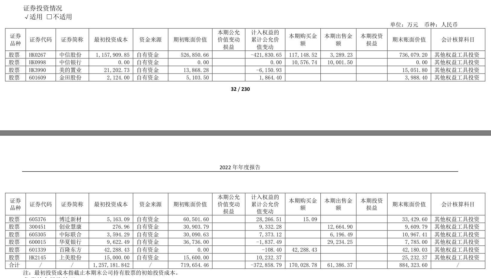 2022年的年报中,雅戈尔特别将证券投资情况单独列出,截至2022年年末,雅戈尔共计持有10只股票的筹码,最初投资成本合计为125.72亿元,期末账面价值合计为88.43亿元。这其中中信股份投入最大,最初投资成本为115.79亿元,期末账面价值73.61亿元。