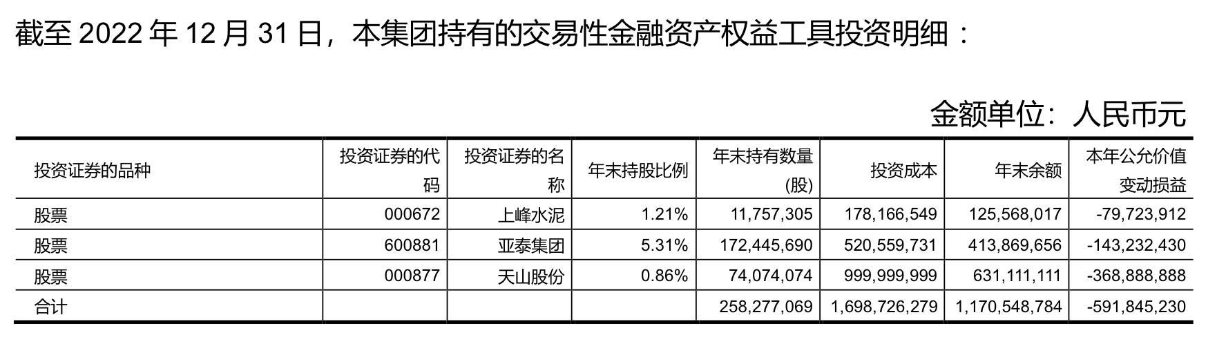 2022年,海螺水泥除了仍然持有上峰水泥和亚泰集团外,又多了天山股份(000877.SZ),三只股票合计投资成本16.99亿元,但年末余额11.71亿元,概念公允价值变动损益为-5.92亿元。
