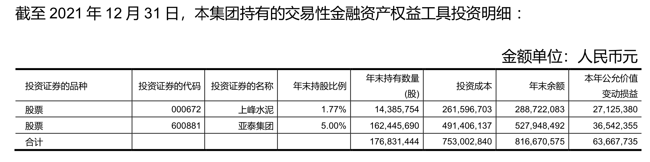 2021年年报,海螺水泥披露持有的交易性金融资产权益工具投资明细,截止2021年年末,海螺水泥持股上峰水泥(000672.SZ)1438.58万股,持有亚泰集团(600881.SH)1.62亿股。两者合计投资成本是7.53亿元,年末余额合计8.17亿元,当年公允价值变动损益为6366.77万元。
