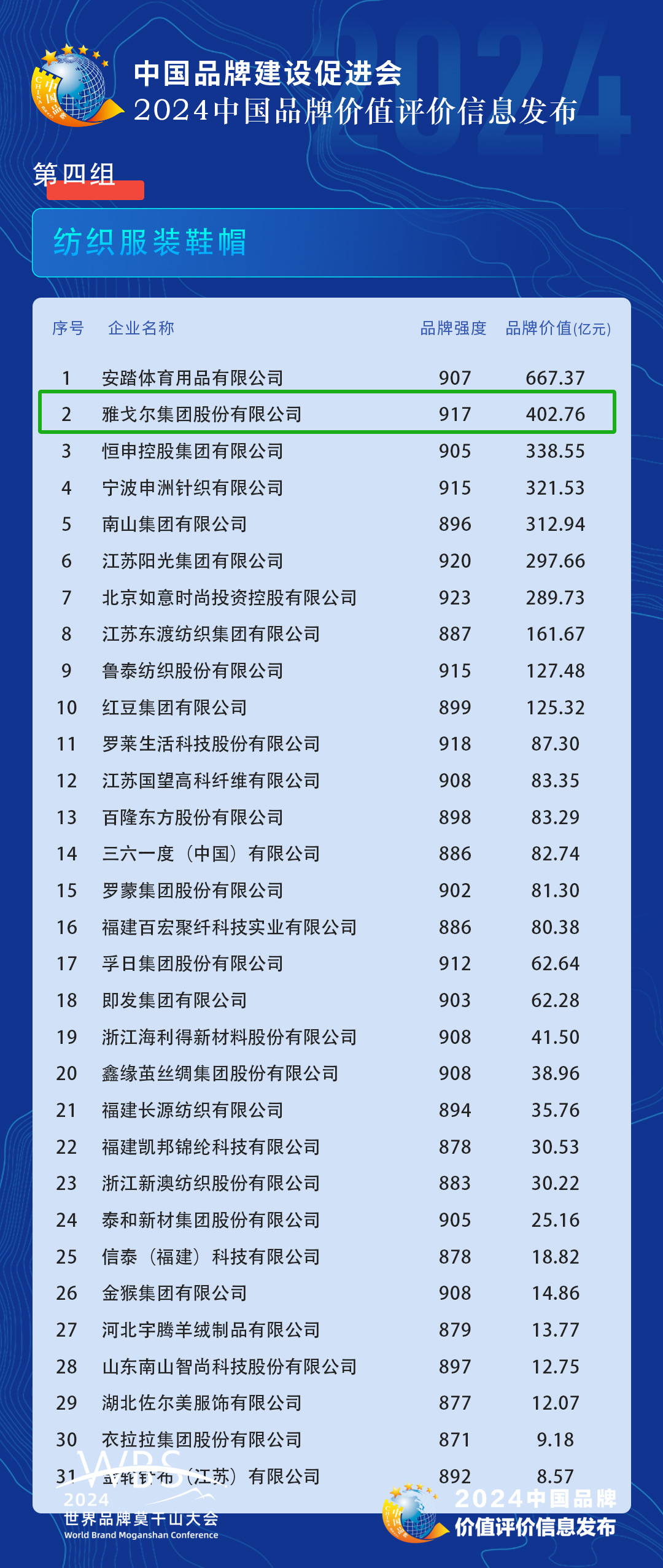 5月11日,新华社、中国品牌建设促进会、中国资产评估协会等单位在浙江德清联合发布“2024中国品牌价值评价信息”。雅戈尔品牌价值402.76亿元,较去年提升28.3亿元,位列“纺织鞋帽服装”榜单第二位。