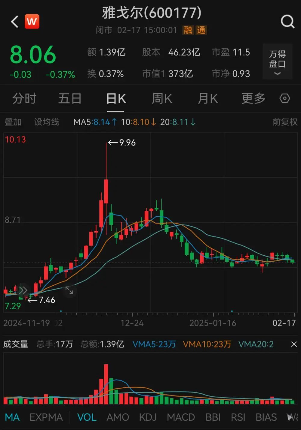 2月17日,雅戈尔股价报收于8.06元/股,最新总市值约为373亿元,股东总户数为7.68万户。