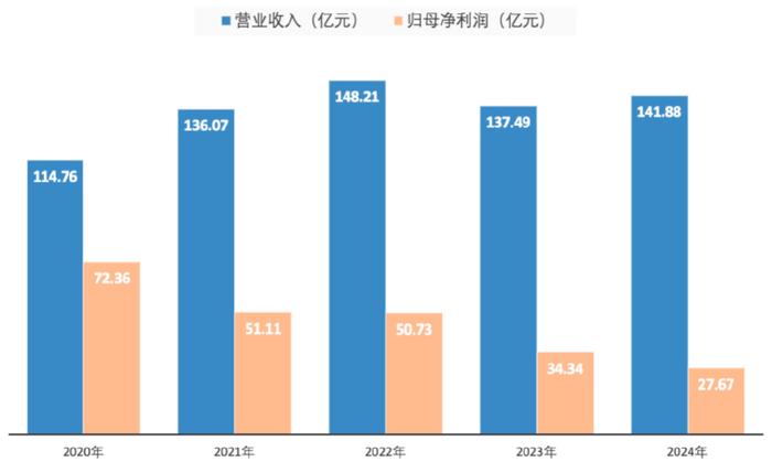雅戈尔最新发布的业绩报告显示,2024年全年,该公司增收不增利,营业收入同比微增3.19%至141.88亿元,归母净利润则较上年同期下降19.41%,降至27.67亿元。这已是该公司归母净利润连续第四年出现下滑,相较于2020年同期,缩水超40亿元。