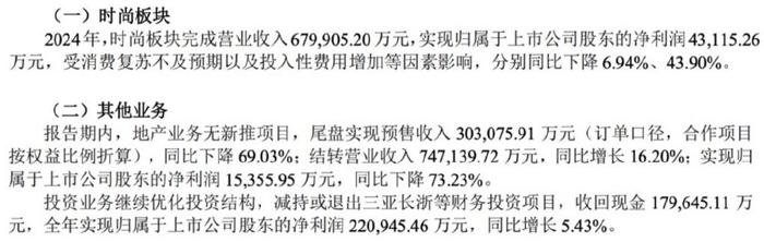 财报显示,2023年和2024年,雅戈尔时尚板块、地产开发两大业务的归母净利润合计分别为13.42亿元和5.85亿元,在该公司各年总归母净利润中占比不足五成,且从39.08%降至21.13%。