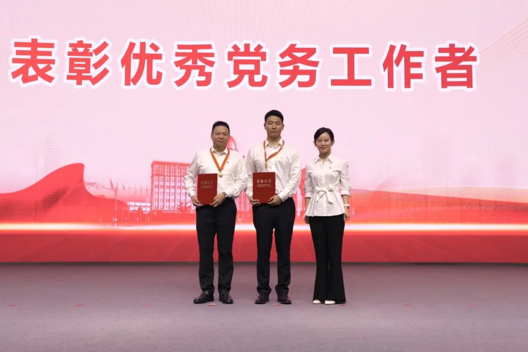 党委书记刘新宇为荣获“优秀共产党员”、“优秀党务工作者”的先进个人颁奖。