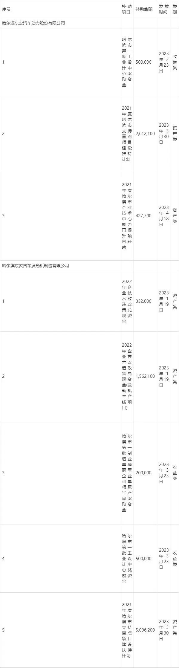 2023年4月18日,哈尔滨东安汽车动力股份有限公司(以下简称“公司”),共收到政府补助1123.01万元(未经审计),具体明细如下: