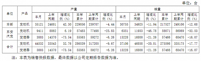 东安动力8月3日公告,公司7月份合计销售发动机3.71万台,同比减少20.81%;合计销售变速器1.32万台,同比减少21.26%。