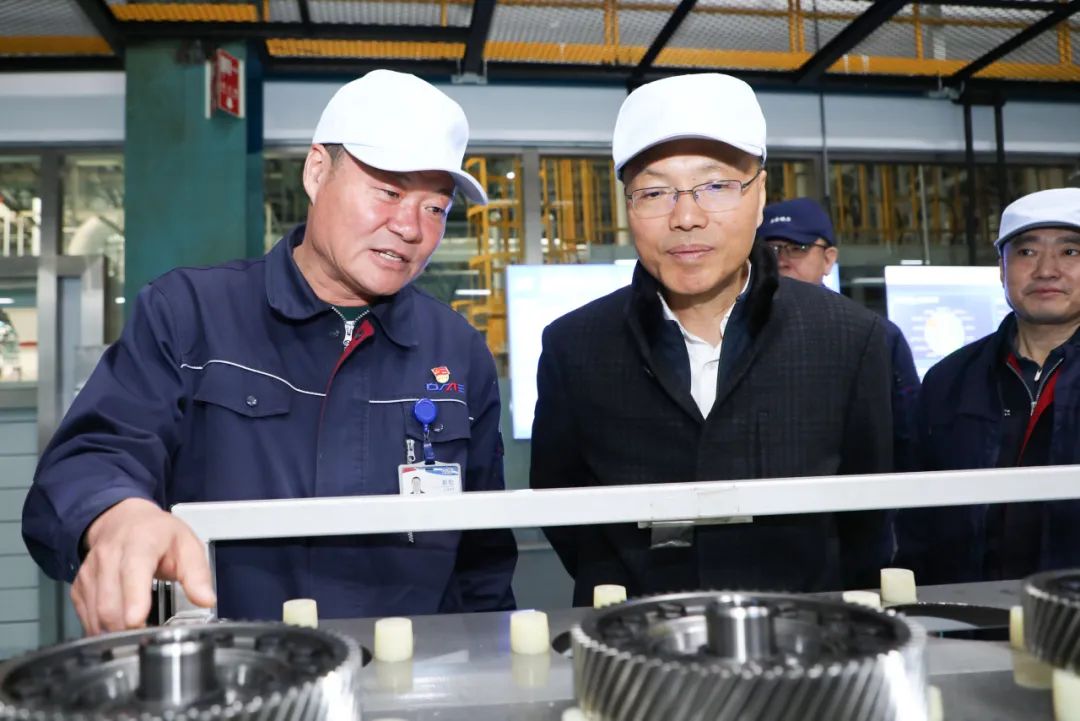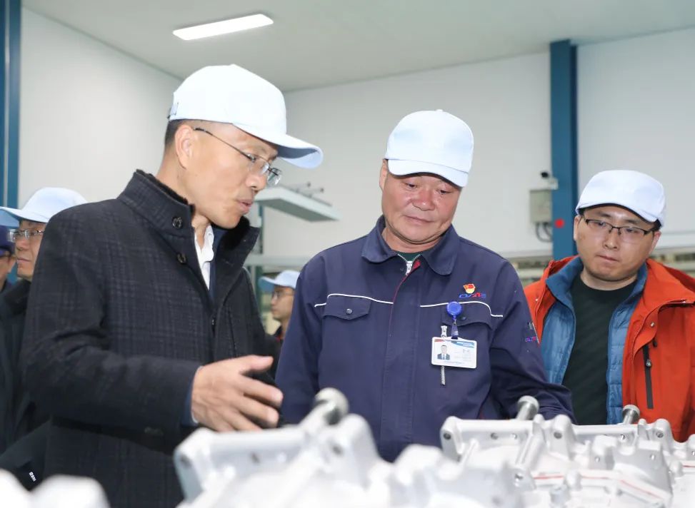 靳松陪同来访人员深入公司科研现场、生产一线以及苗秀技能大师工作室,详细介绍公司产品谱系、改革发展和生产经营情况。