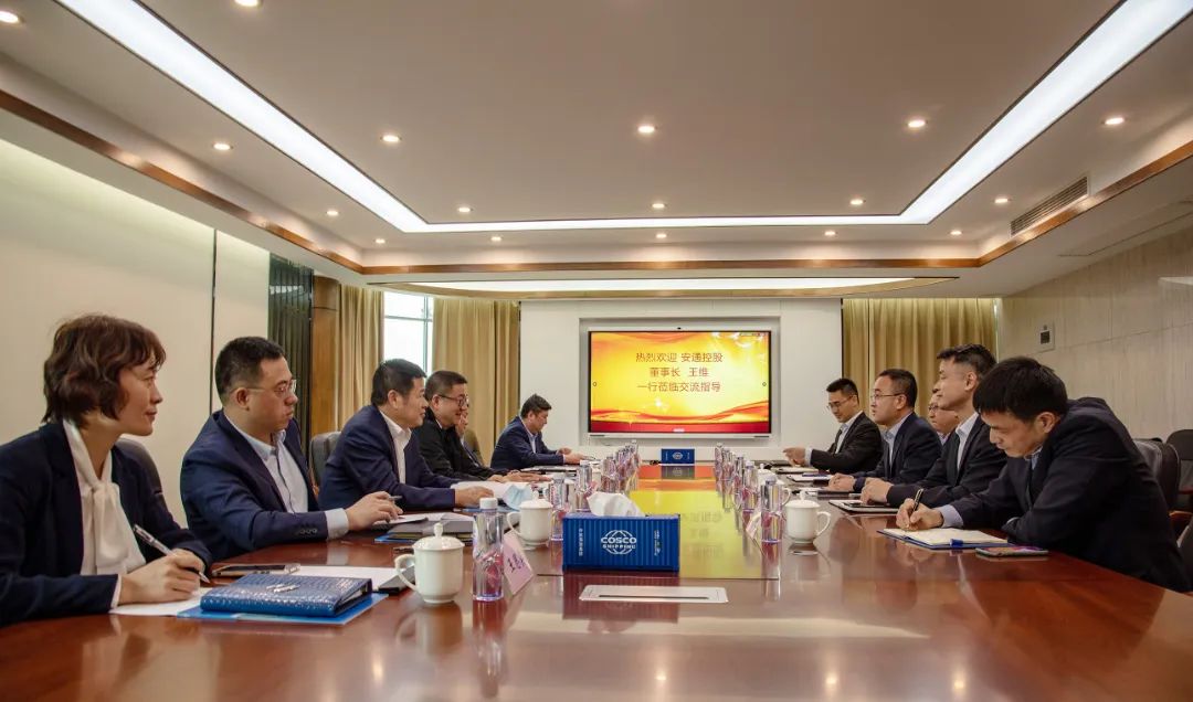 5月25日下午,安通控股股份有限公司党委书记、董事长王维带队拜访泉州太平洋集装箱码头有限公司董事总经理孙博生,双方就携手共进、深化合作开展座谈交流。安通控股股份有限公司董事总裁楼建强参加。