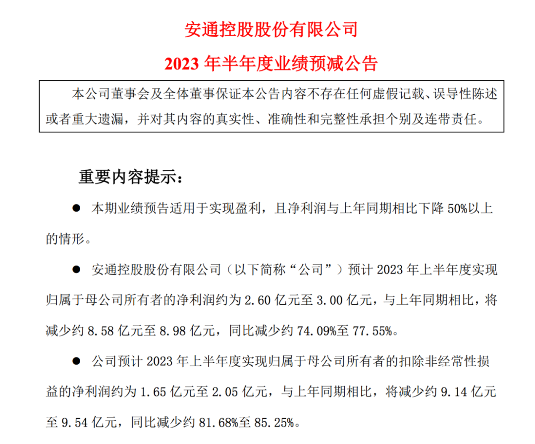 7月15日,安通控股发布2023年半年度业绩预减公告。