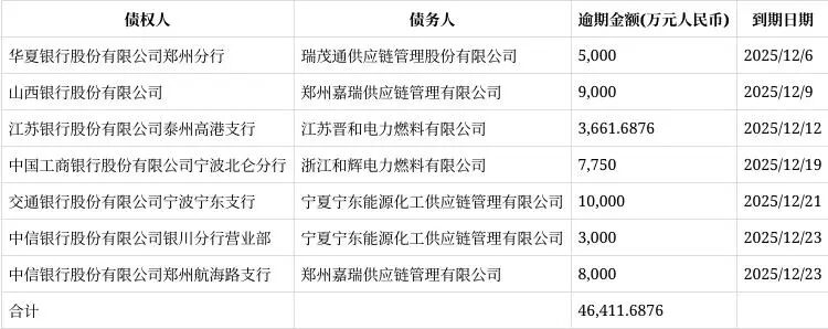 公告披露,自前次债务逾期公告(12月5日)以来,瑞茂通及旗下子公司新增金融机构借款逾期金额合计约4.64亿元,具体明细如下:
