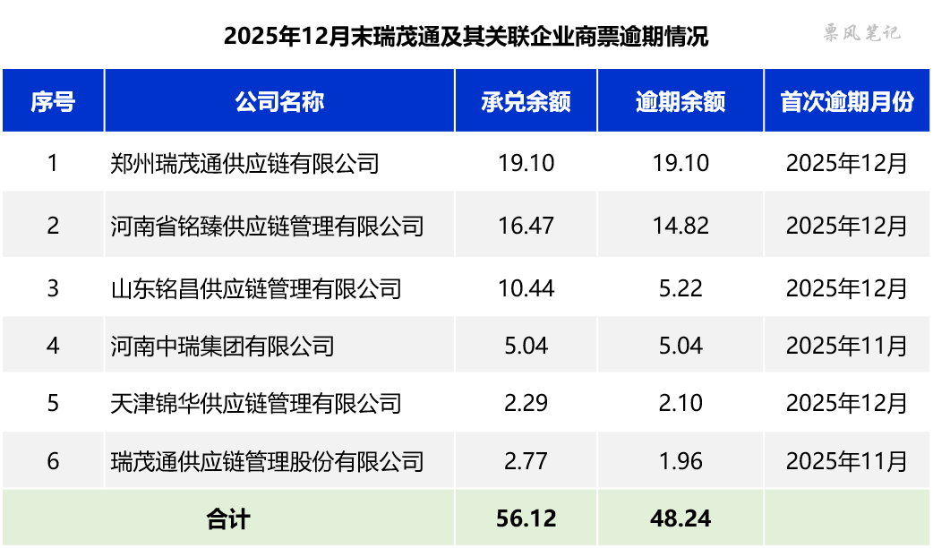 2026年1月9日,上海票据交易所公布2025年12月票据承兑人逾期名单,瑞茂通及其关联企业排名前列,据不完全统计,2025年末其商票逾期余额超过48亿元,为2024年以来商票逾期规模最高的大型企业。