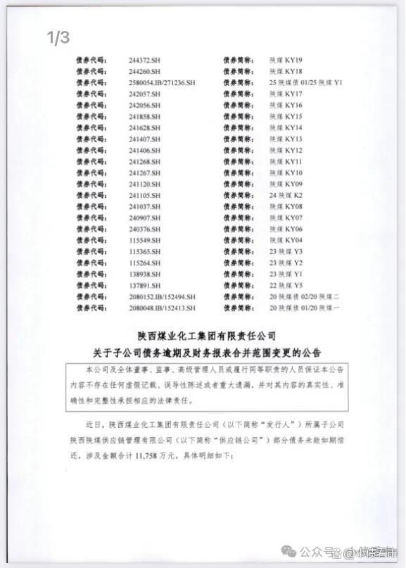 1月30日,陕西煤业化工集团有限责任公司(以下简称“陕煤集团”)公告称,其子公司陕西陕煤供应链管理有限公司(以下简称“供应链公司”)部分债务未能如期偿还,涉及金额合计1.176亿元。
